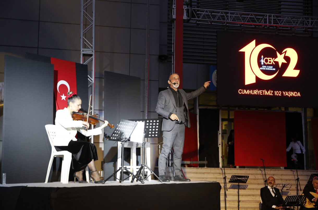 Gecede, 3 Mart Eğitim Kurumları Proje Koordinatörü İbrahim Zeki Karabulut'un yazıp yönettiği ve anlatıcılığını yaptığı "Kurtuluştan Kuruluşa Cumhuriyet" adlı gösteri sahnelendi. Yerleşke içinde kurulan beş sahnede öğrencilerin performansları ve Karabulut'un etkileyici anlatımı, izleyenlere duygu dolu anlar yaşattı. Gösteri sonunda bahçeyi dolduran konuklar, sahne alan öğrencileri dakikalarca ayakta alkışladı. Okul girişinde öğrencilerin hazırladığı Atatürk ve Cumhuriyet temalı resim sergisi de katılımcıların beğenisini topladı.