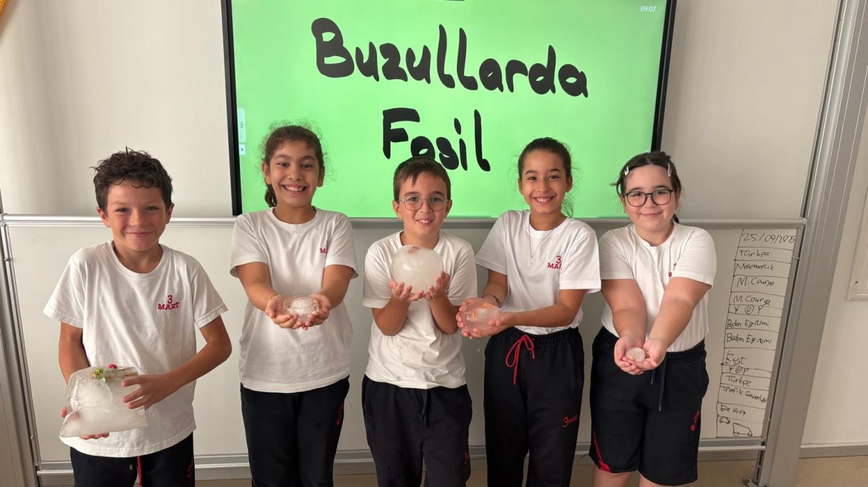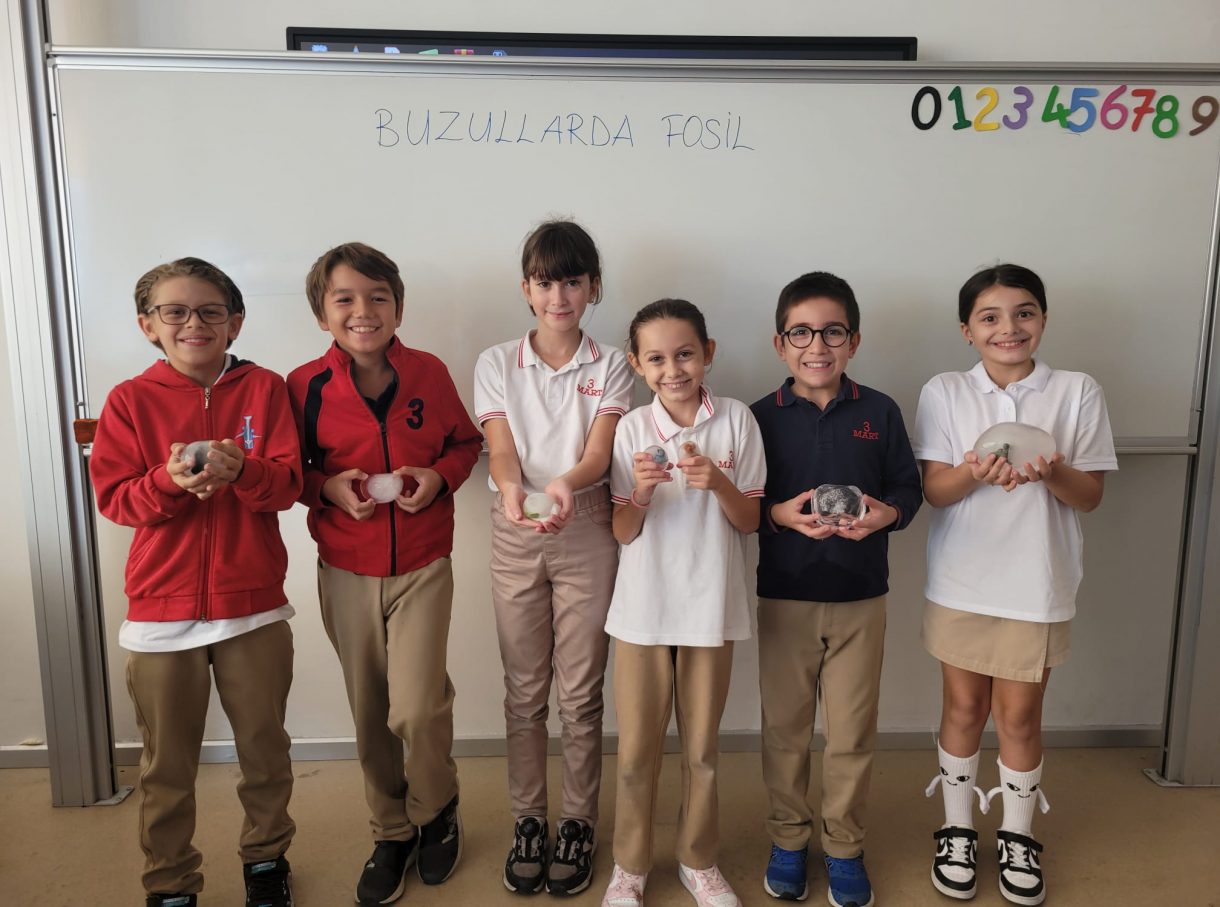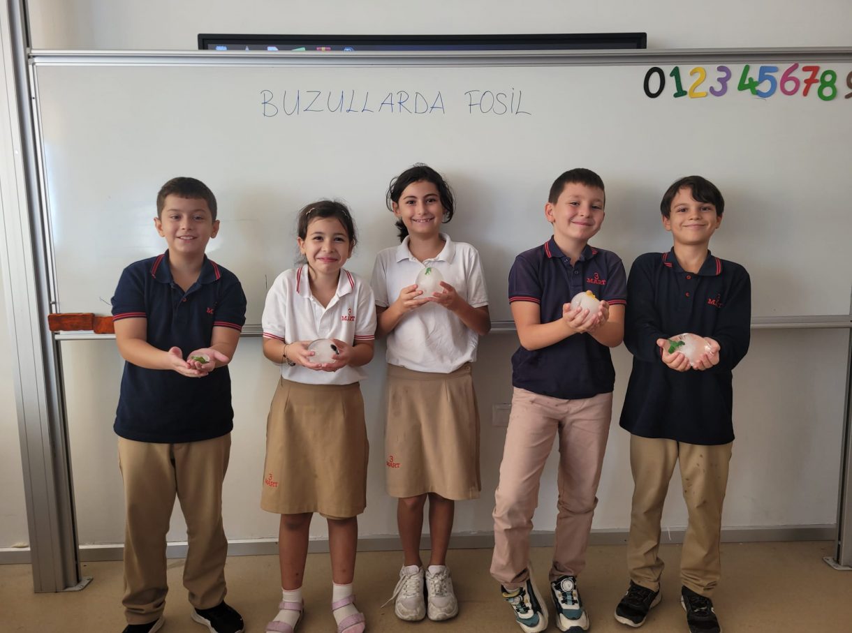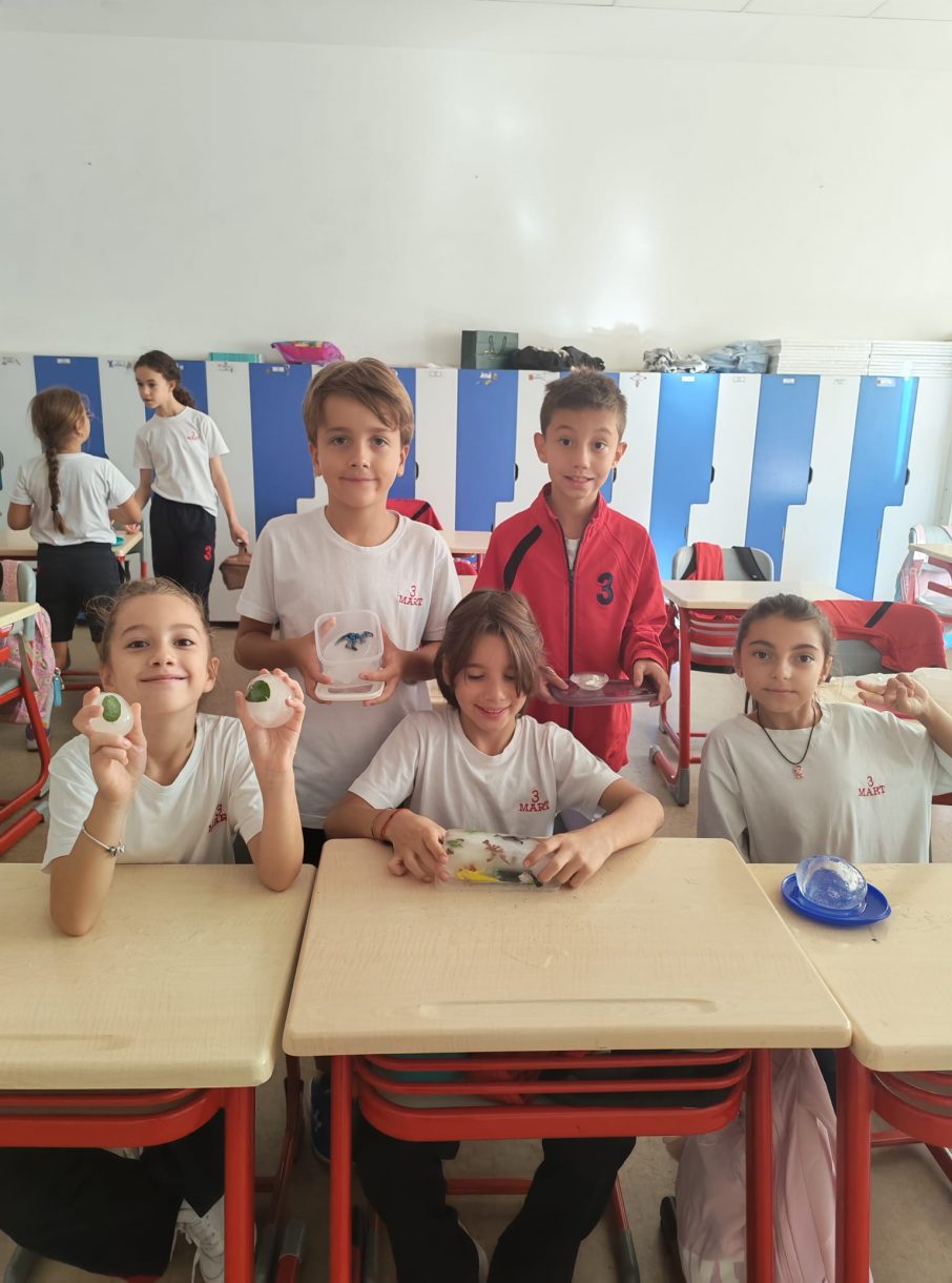 3 Mart Azizoğlu İlkokulu 4. sınıf öğrencileri, Fen Bilimleri dersinde "Fosiller" konusunu işlerken "Buzullarda Fosiller" deneyi gerçekleştirdi.