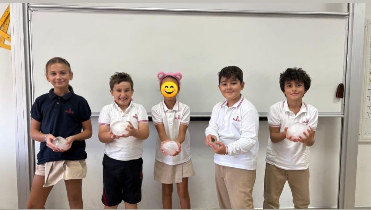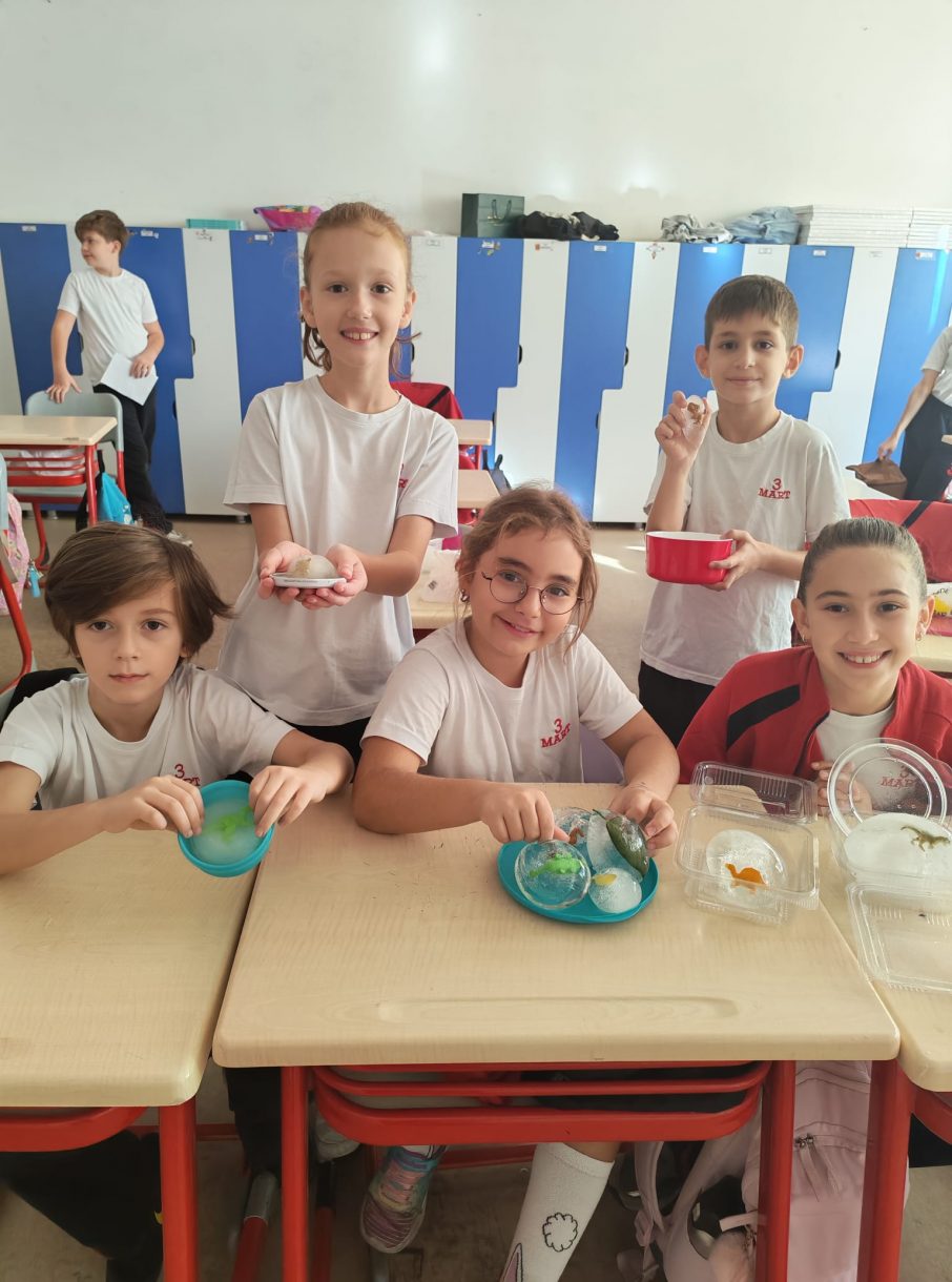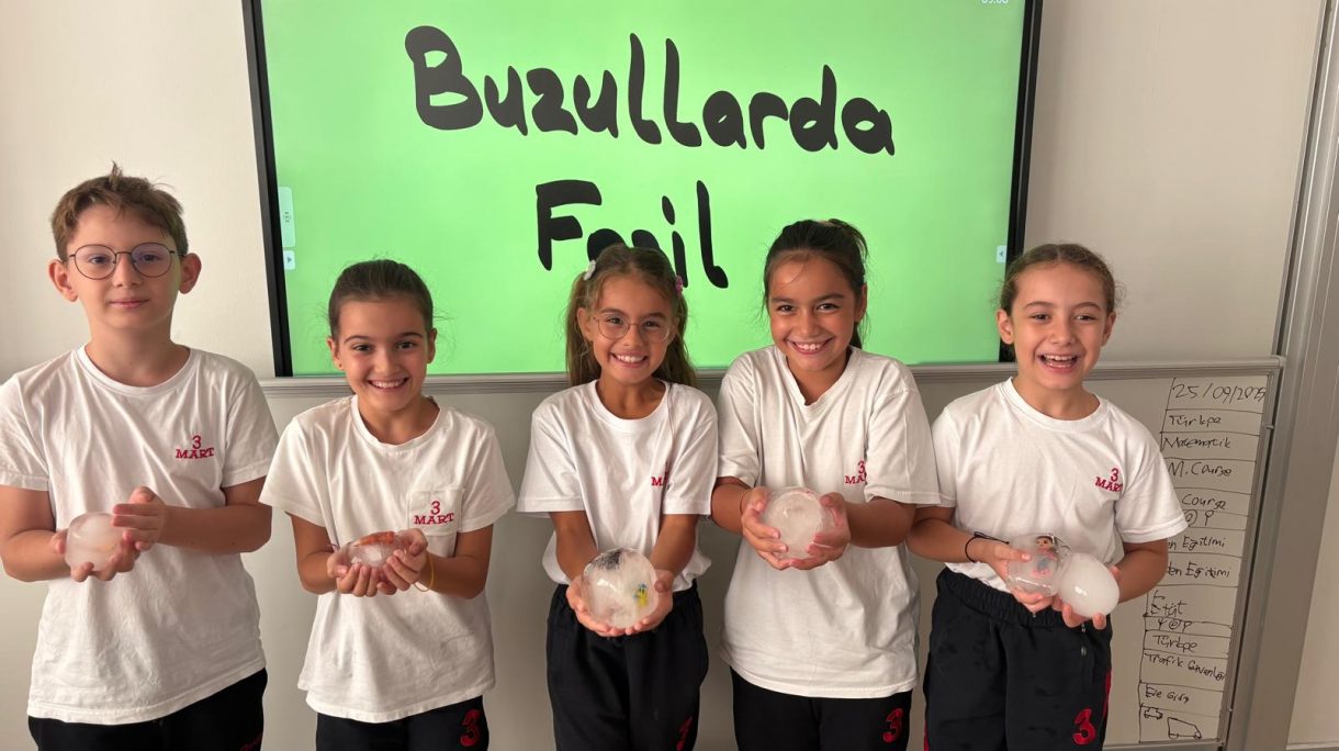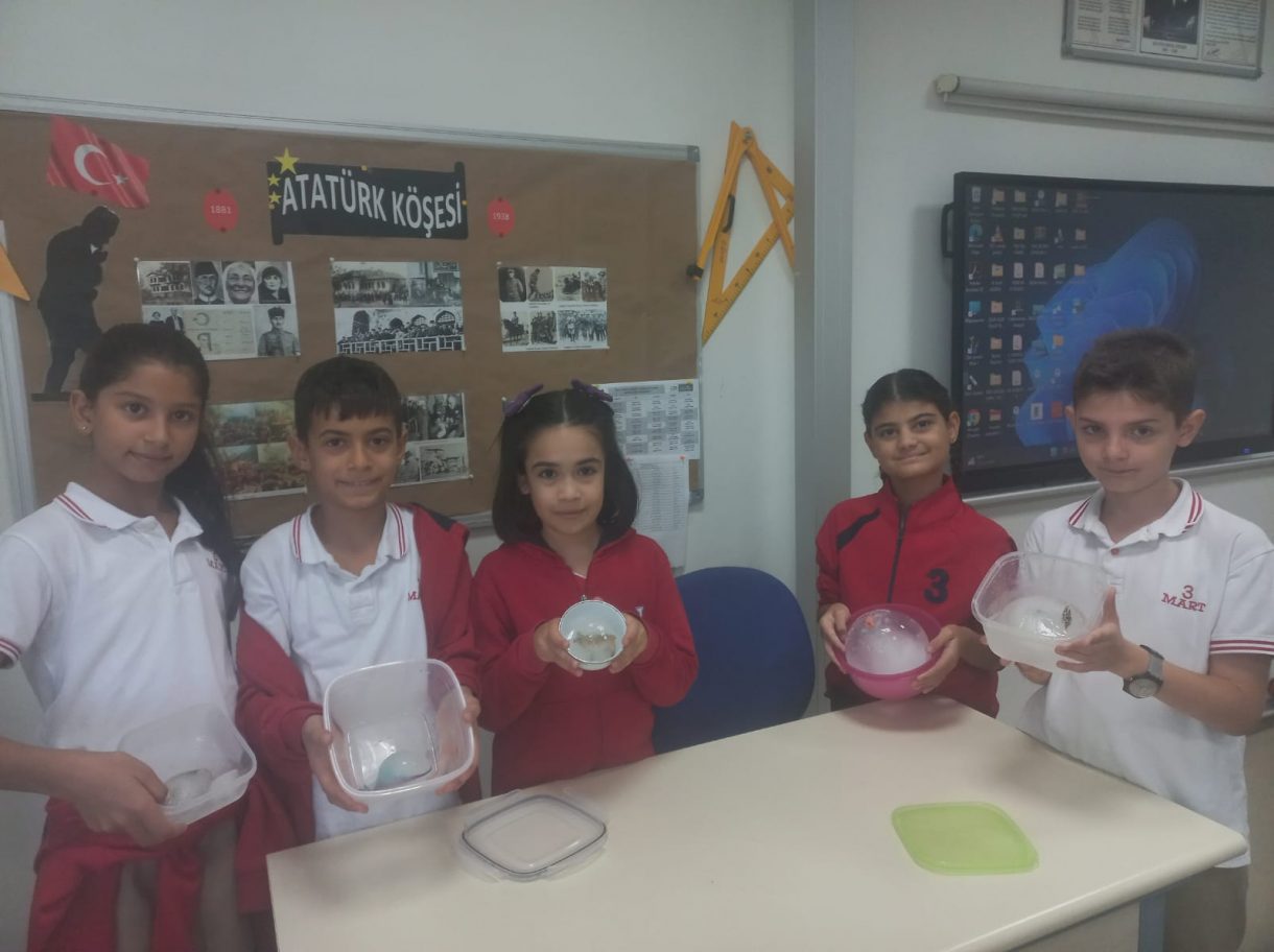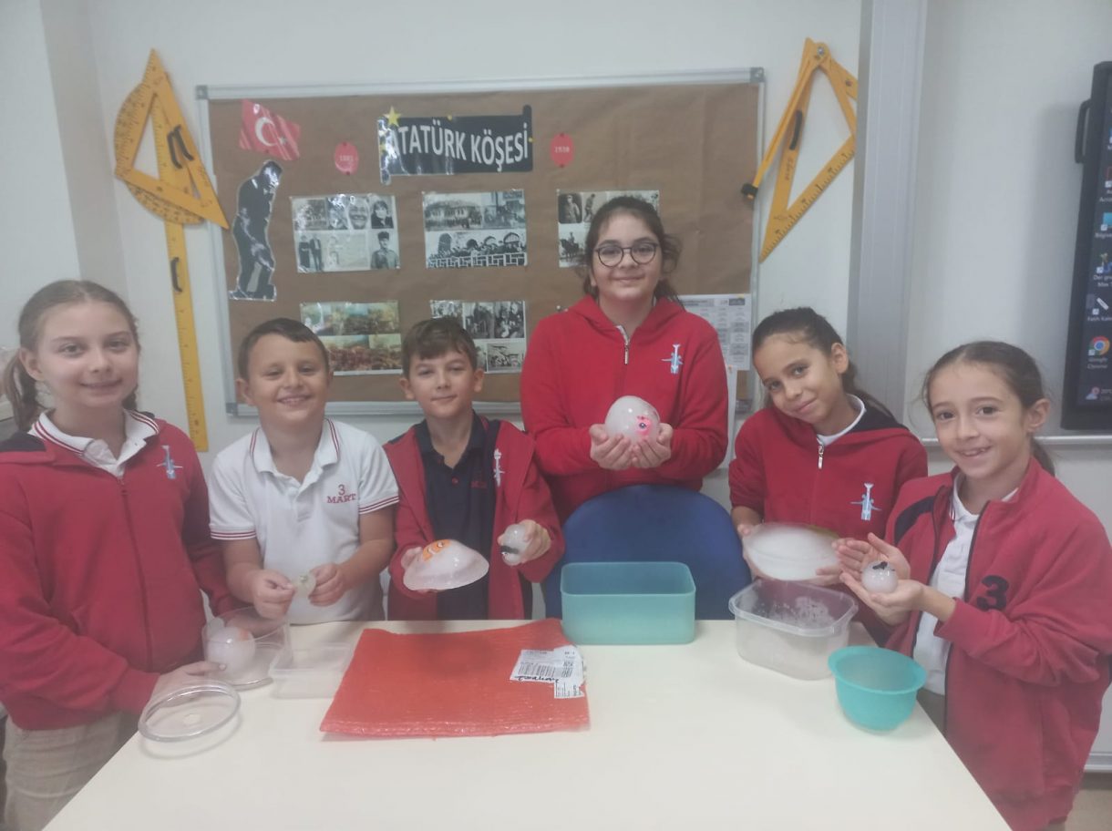3 Mart Azizoğlu İlkokulu 4. sınıf öğrencileri, Fen Bilimleri dersinde "Fosiller" konusunu işlerken "Buzullarda Fosiller" deneyi gerçekleştirdi.