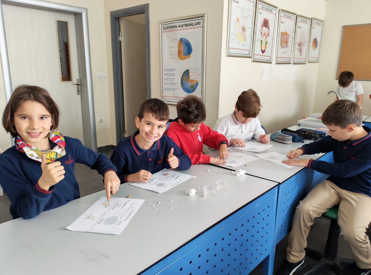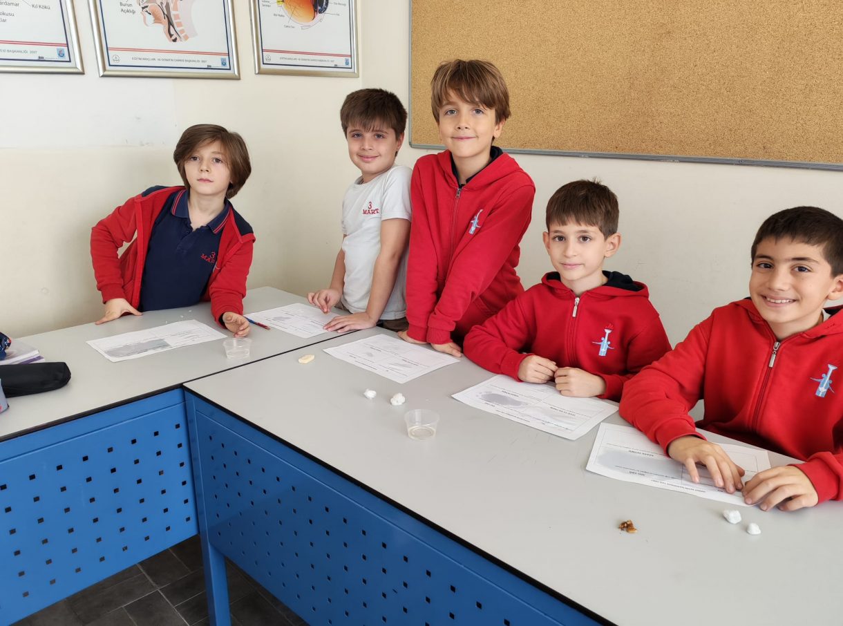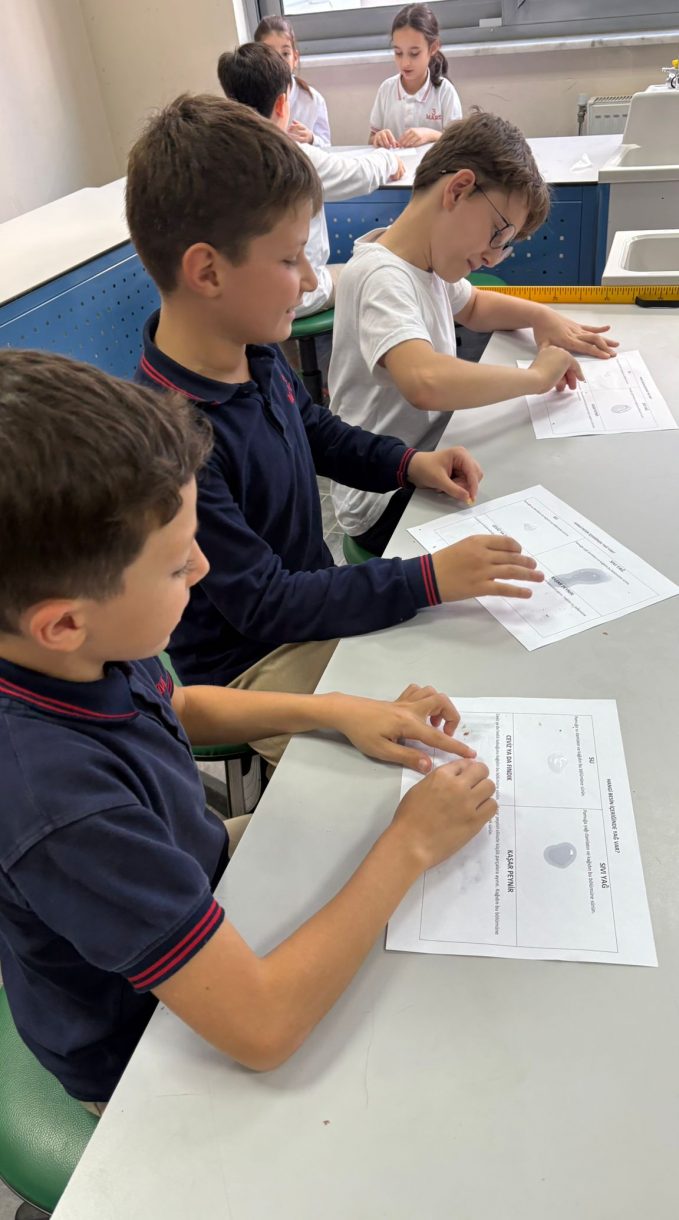 Ders kapsamında farklı besinleri inceleyen öğrenciler, hangi gıdalarda yağ bulunduğunu gözlemleyerek bilimin ışığında keşfetmenin keyfini yaşadı. Deney süresince hem eğlendiler hem de öğrendiler.