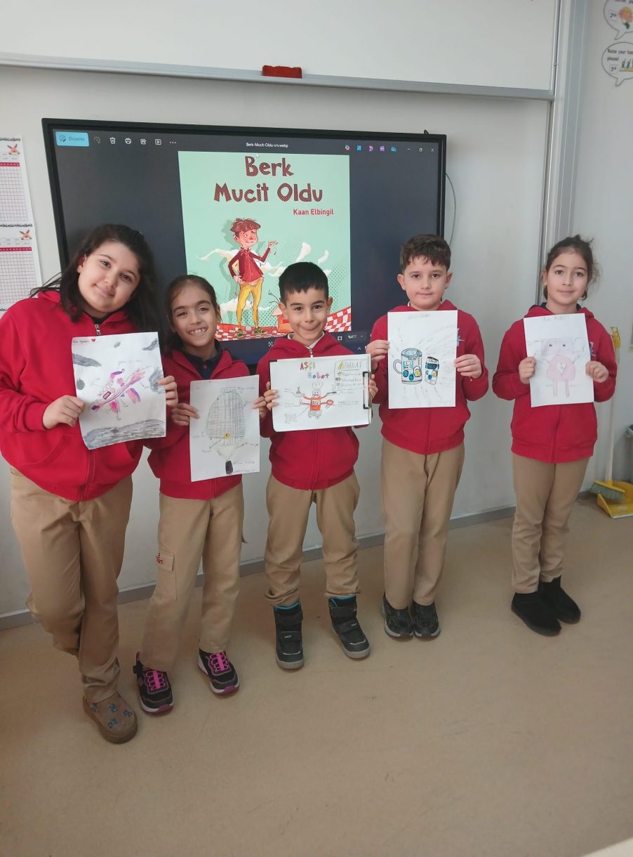 3 Mart Azizoğlu İlkokulu 3. sınıf öğrencileri, Berk Mucit Oldu kitabını okuyarak hayal güçlerini harekete geçirdi ve kendi icatlarını tasarladı.