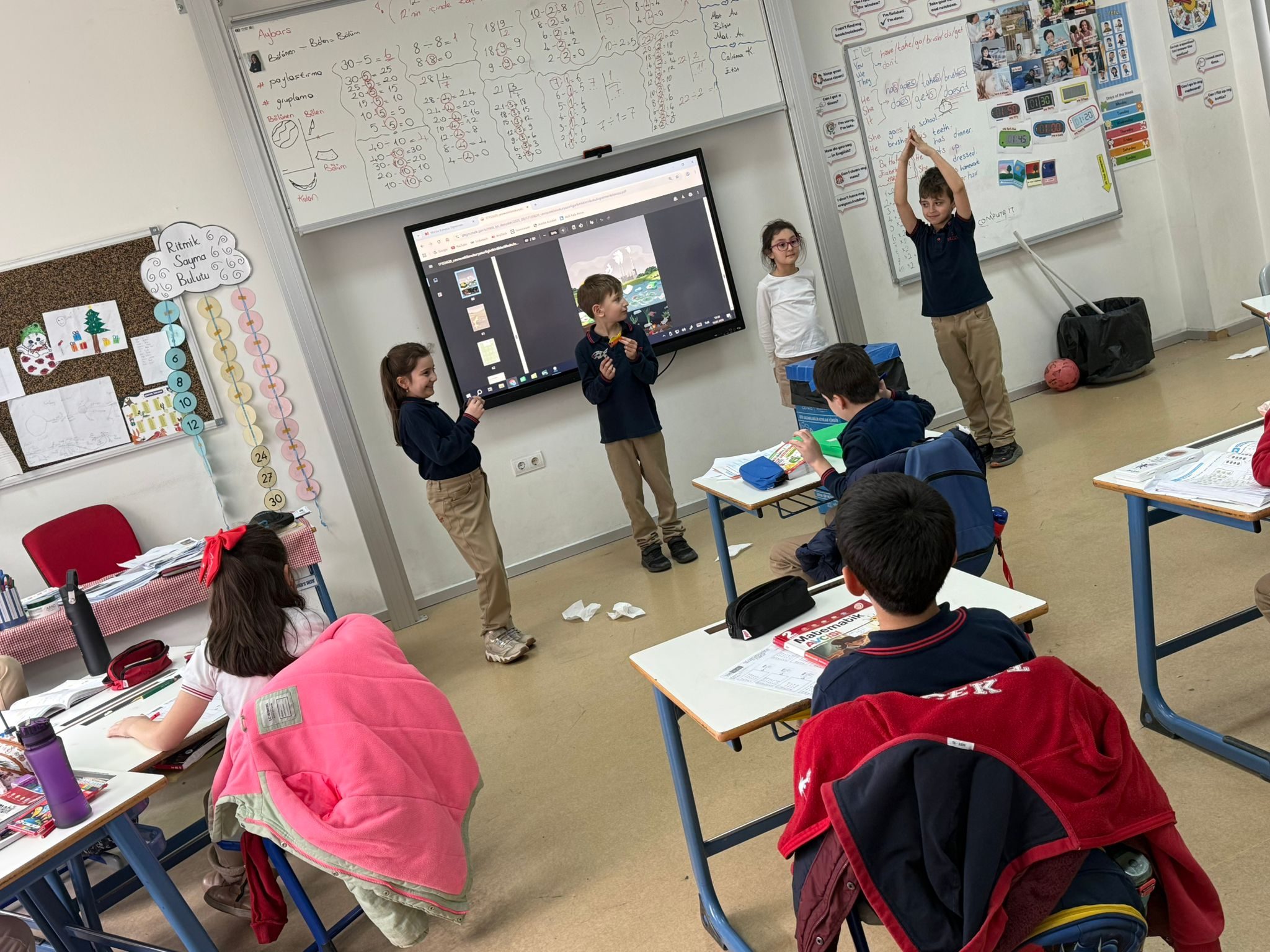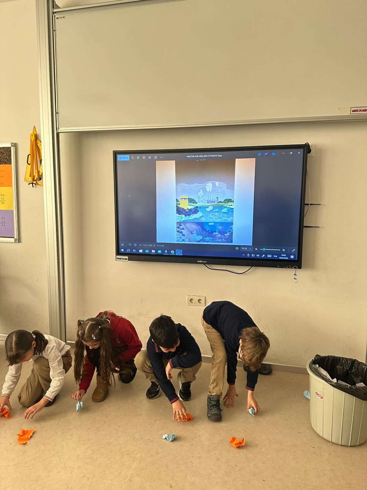 Canlandırmaların en vurucu bölümleri ise kirli sularda yaşam mücadelesi veren canlıların durumunun sahnelendiği anlar oldu. İkinci sınıf öğrencileri, plastik atıklar ve zehirli maddelerle dolu sularda nefes almaya, yüzmeye ve hayatta kalmaya çalışan balıkların, kaplumbağaların ve diğer su canlılarının karşılaştığı zorlukları büyük bir empatiyle yansıttılar.