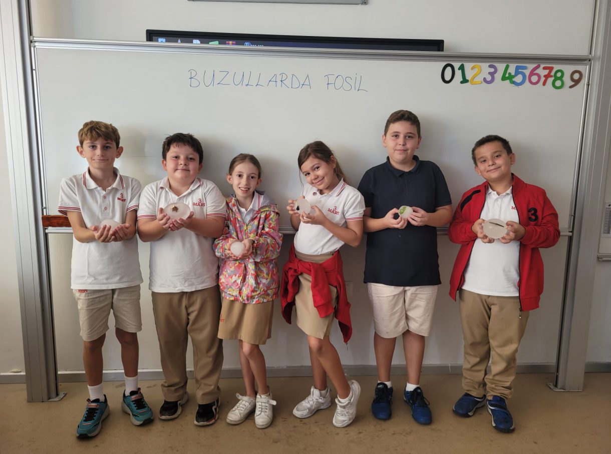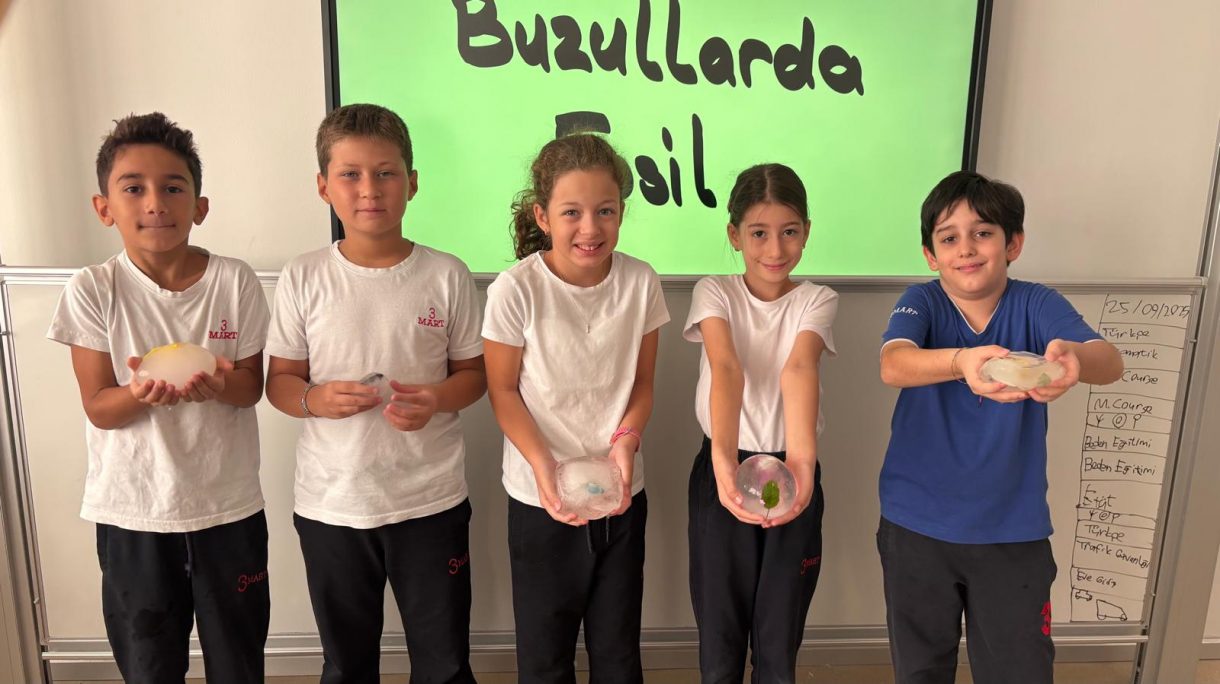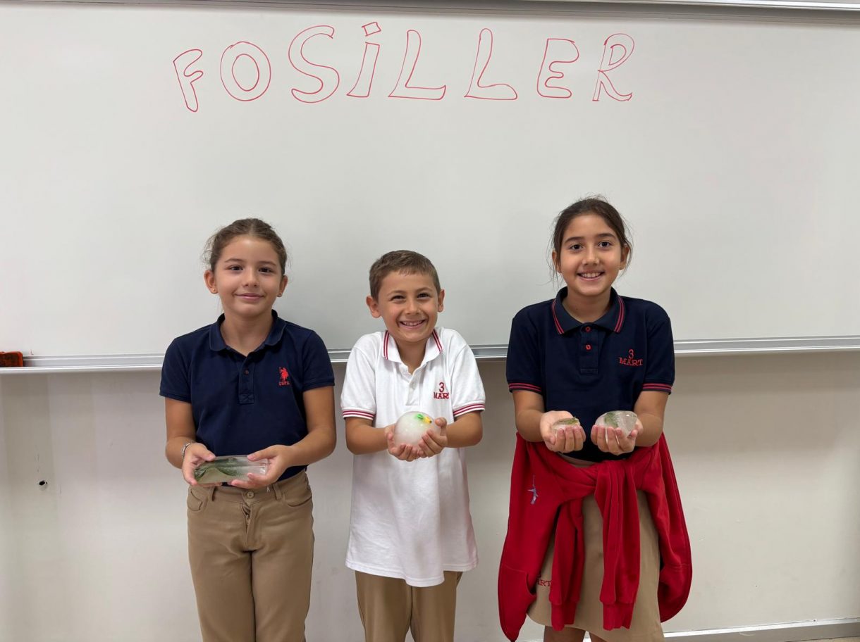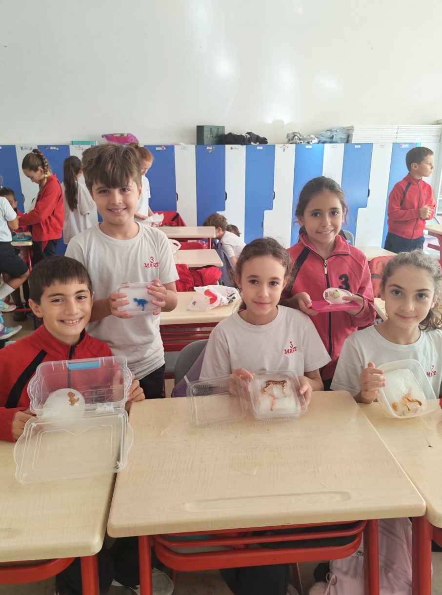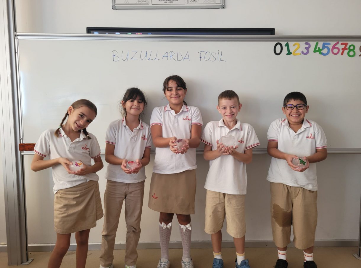 3 Mart Azizoğlu İlkokulu 4. sınıf öğrencileri, Fen Bilimleri dersinde "Fosiller" konusunu işlerken "Buzullarda Fosiller" deneyi gerçekleştirdi.