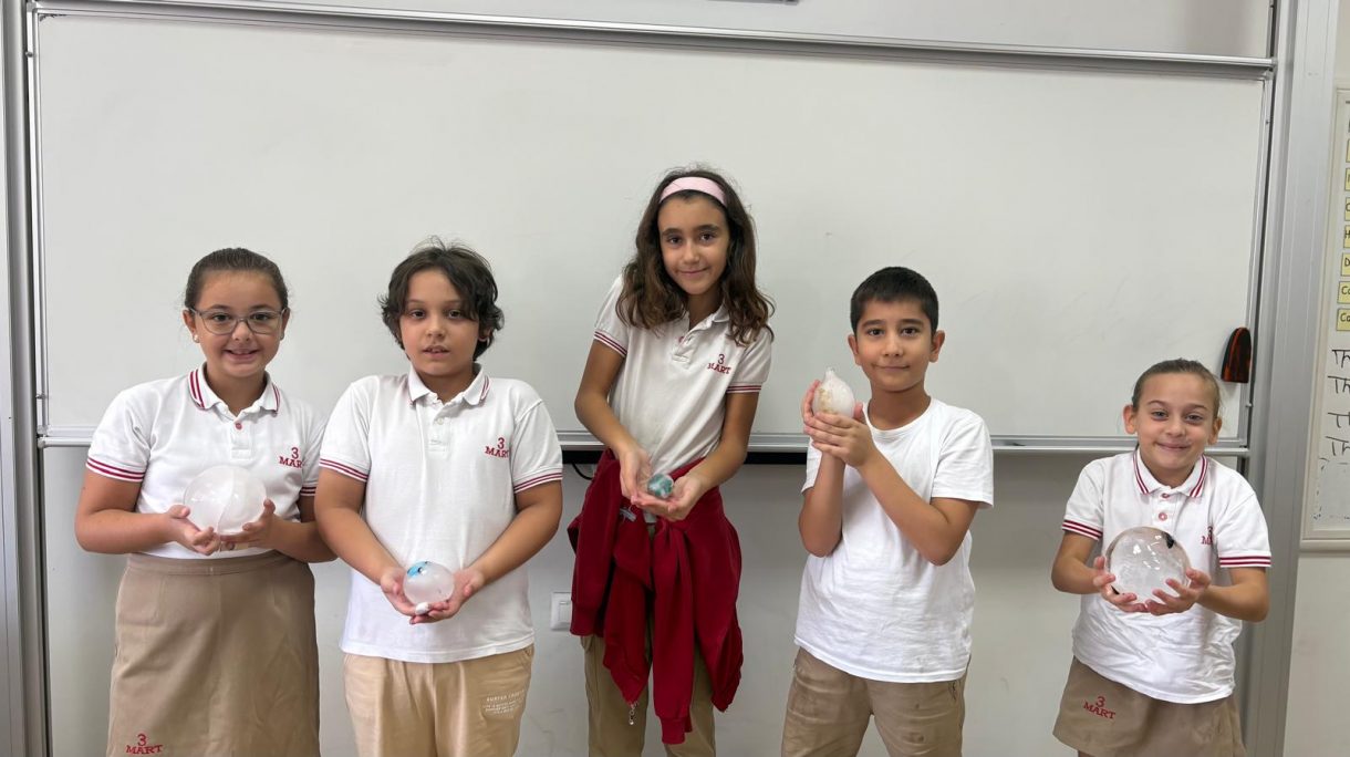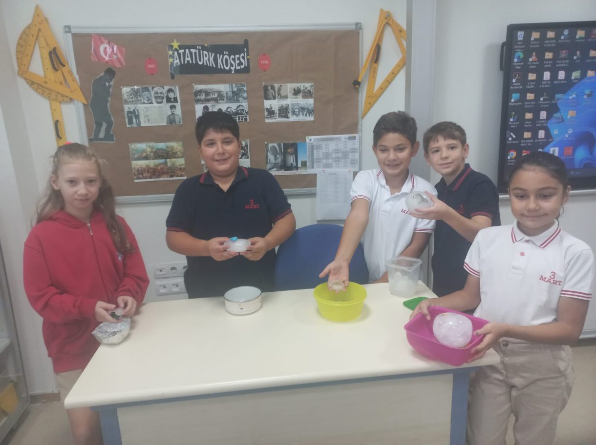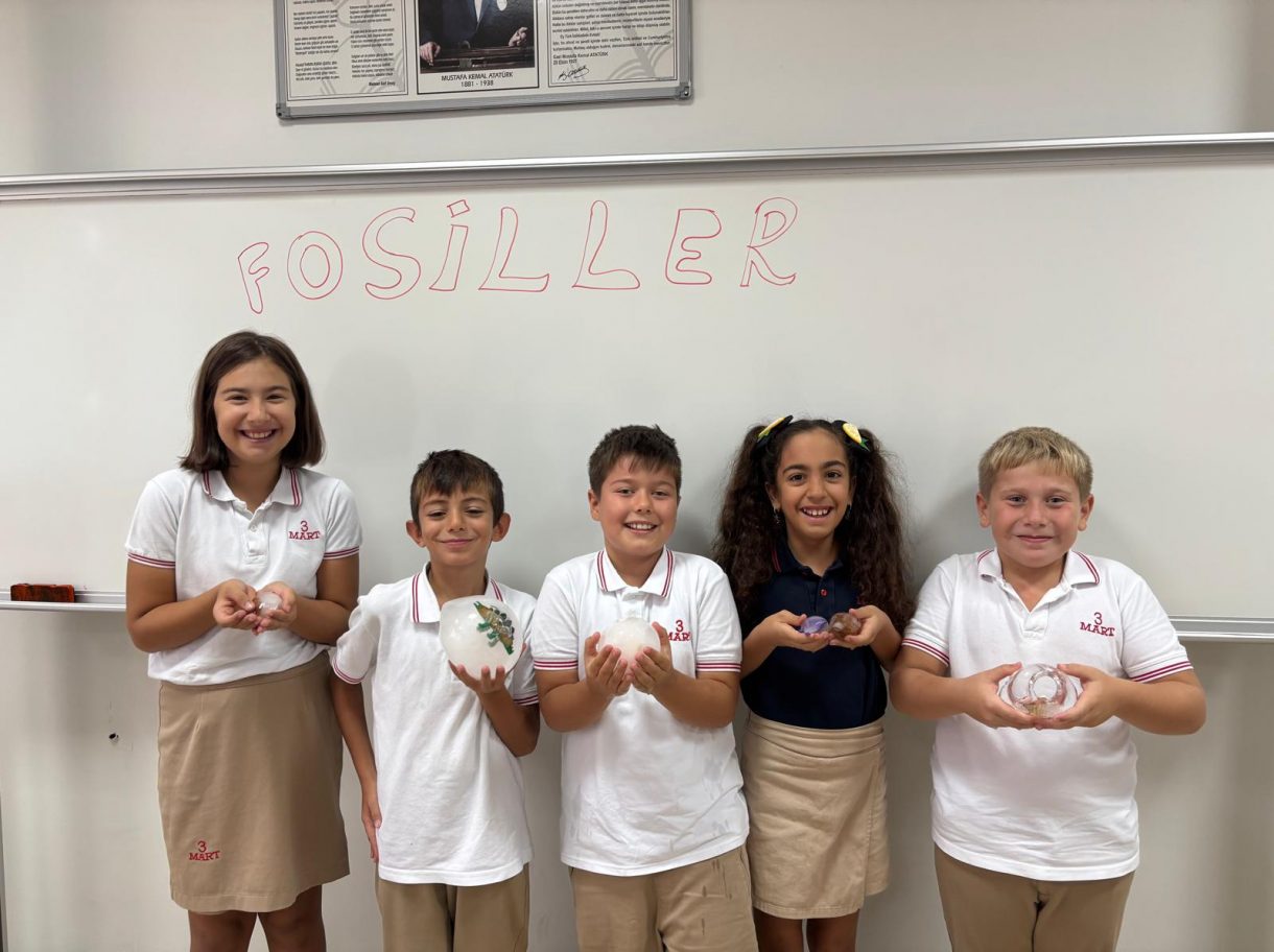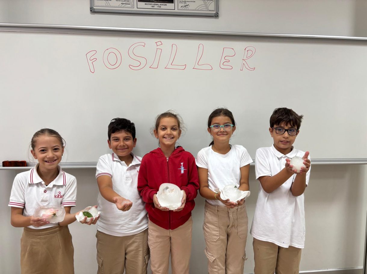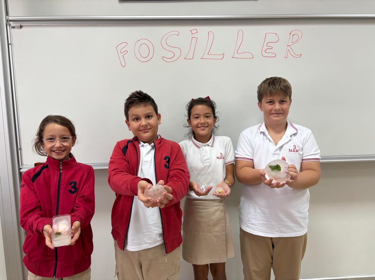 3 Mart Azizoğlu İlkokulu 4. sınıf öğrencileri, Fen Bilimleri dersinde "Fosiller" konusunu işlerken "Buzullarda Fosiller" deneyi gerçekleştirdi.
