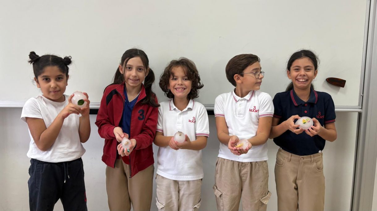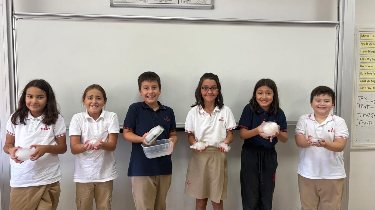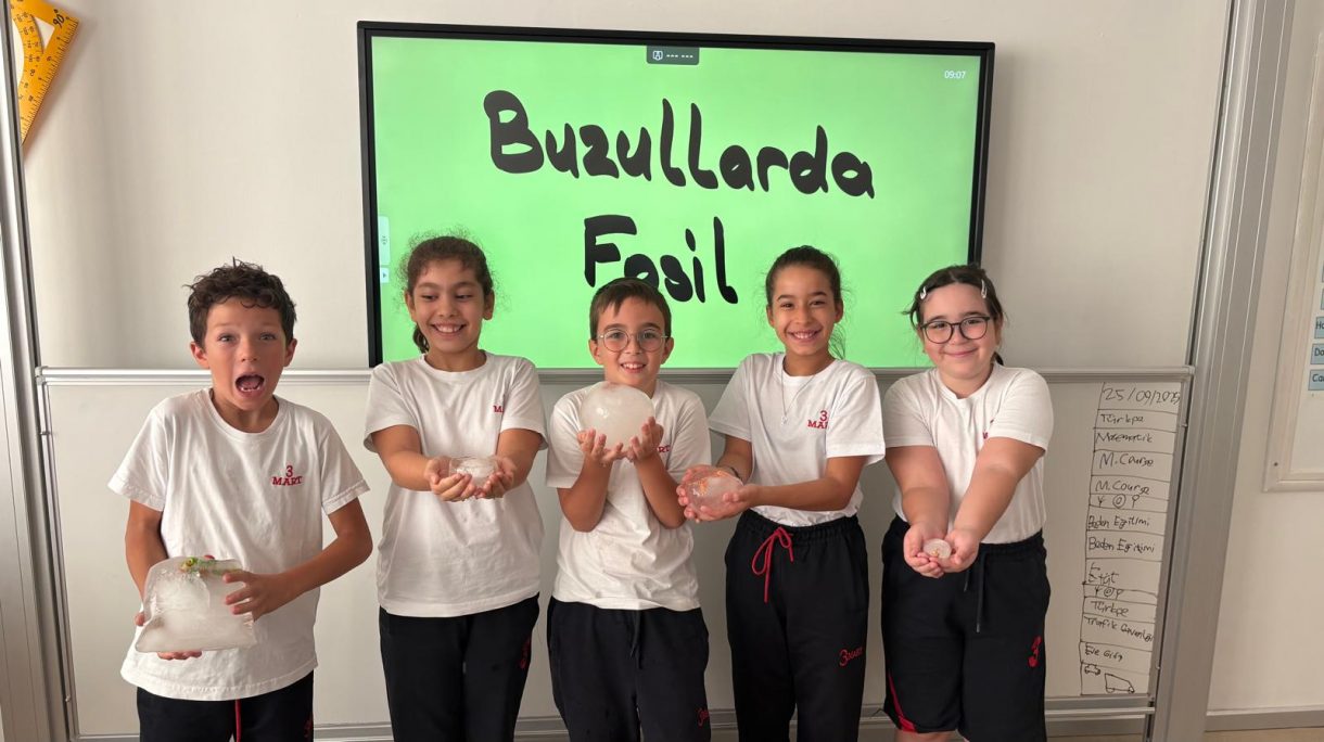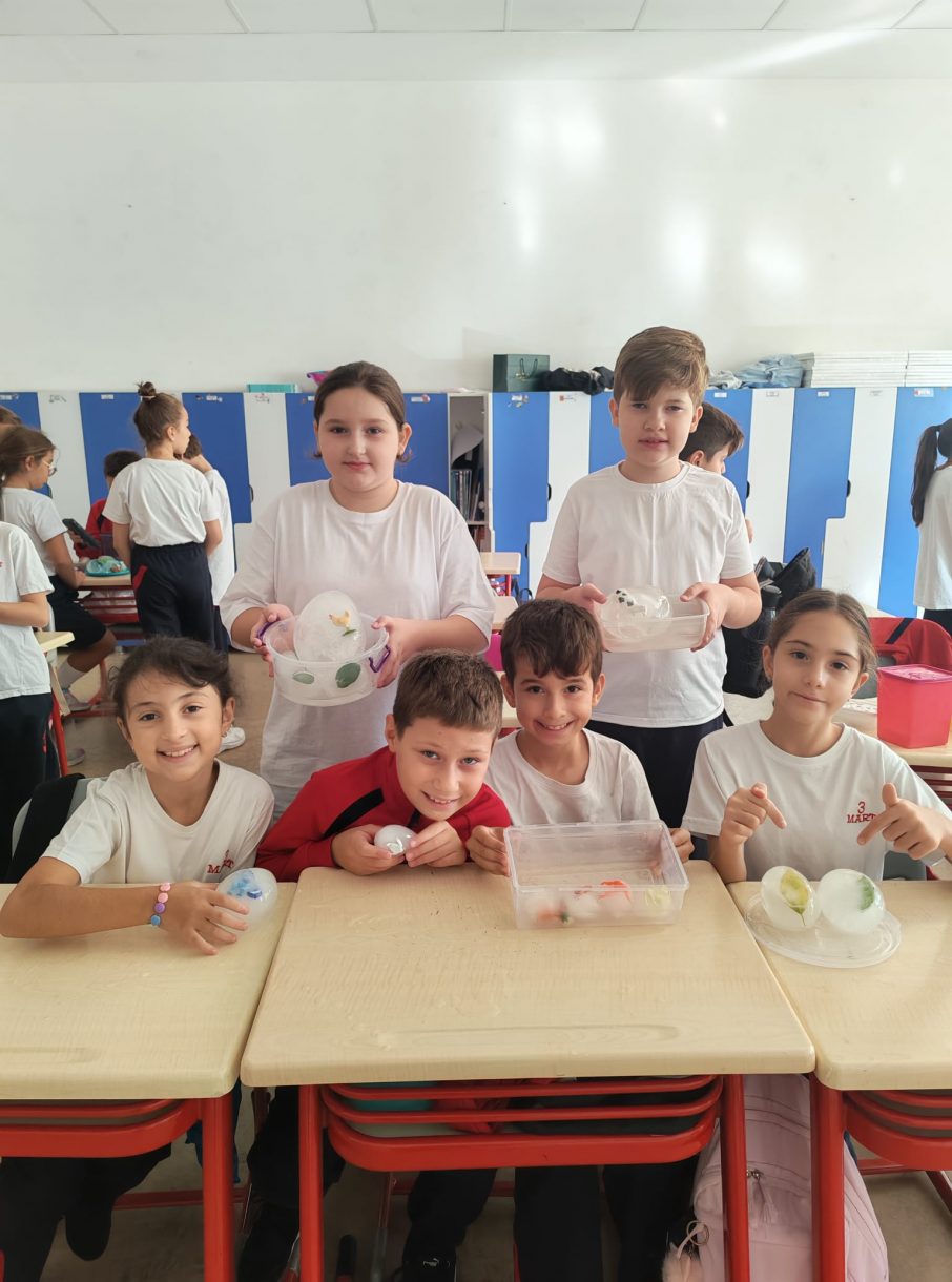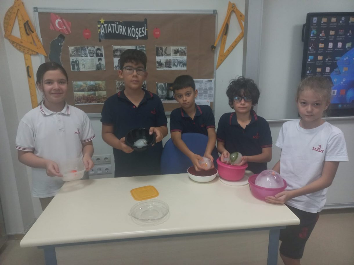 3 Mart Azizoğlu İlkokulu 4. sınıf öğrencileri, Fen Bilimleri dersinde "Fosiller" konusunu işlerken "Buzullarda Fosiller" deneyi gerçekleştirdi.