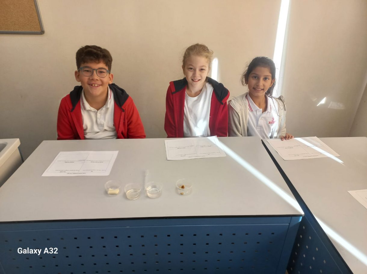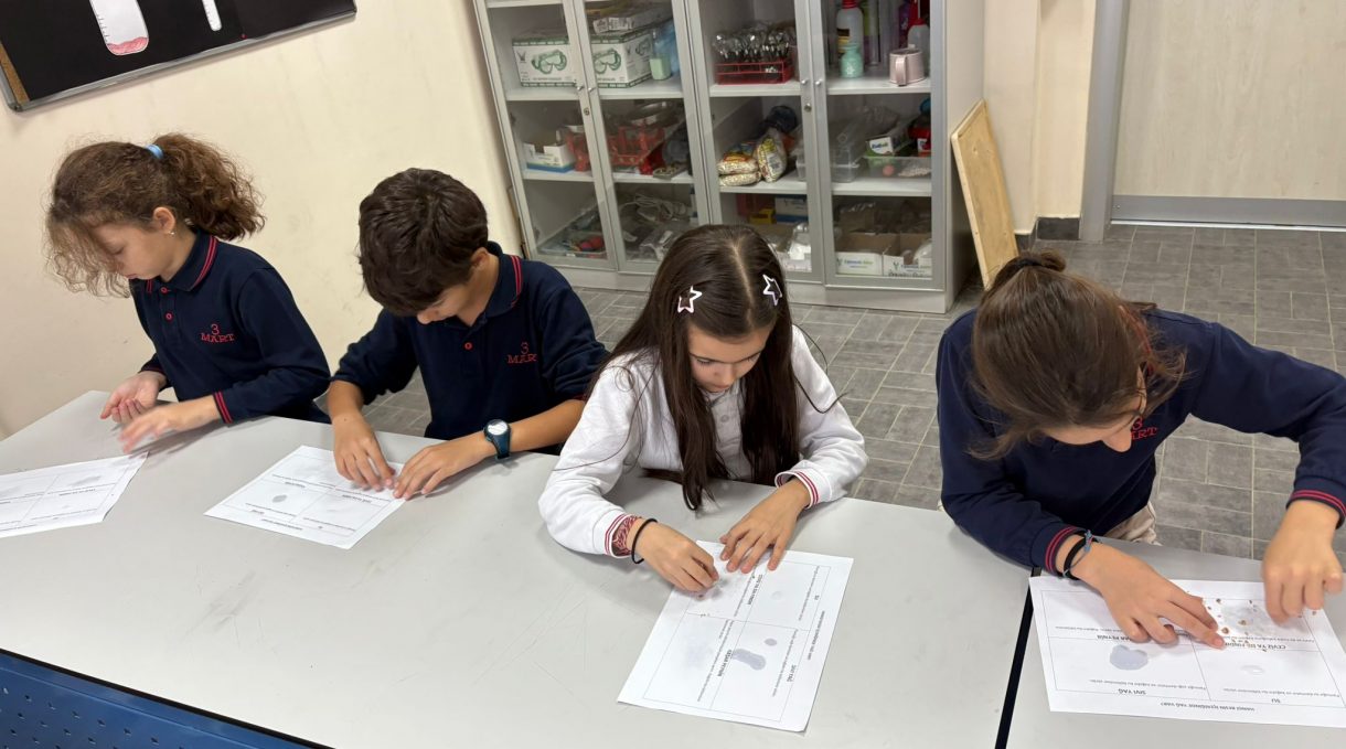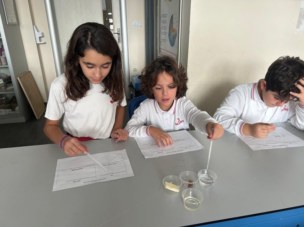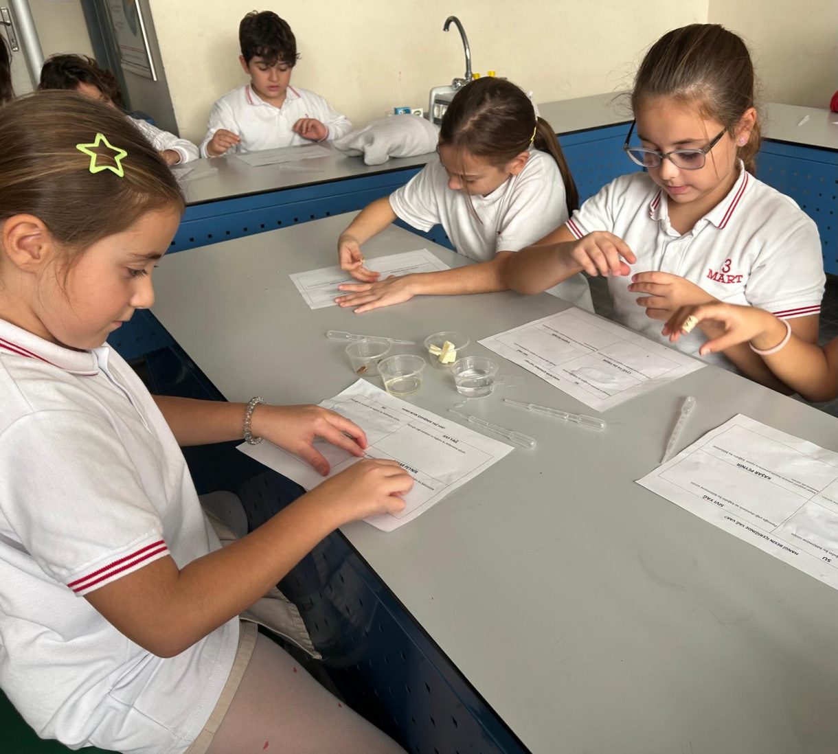 Ders kapsamında farklı besinleri inceleyen öğrenciler, hangi gıdalarda yağ bulunduğunu gözlemleyerek bilimin ışığında keşfetmenin keyfini yaşadı. Deney süresince hem eğlendiler hem de öğrendiler.