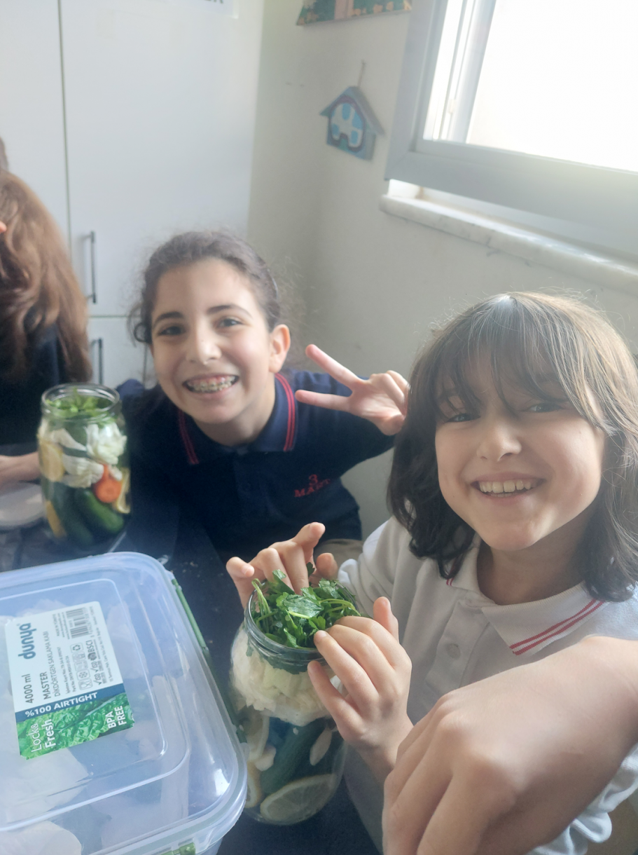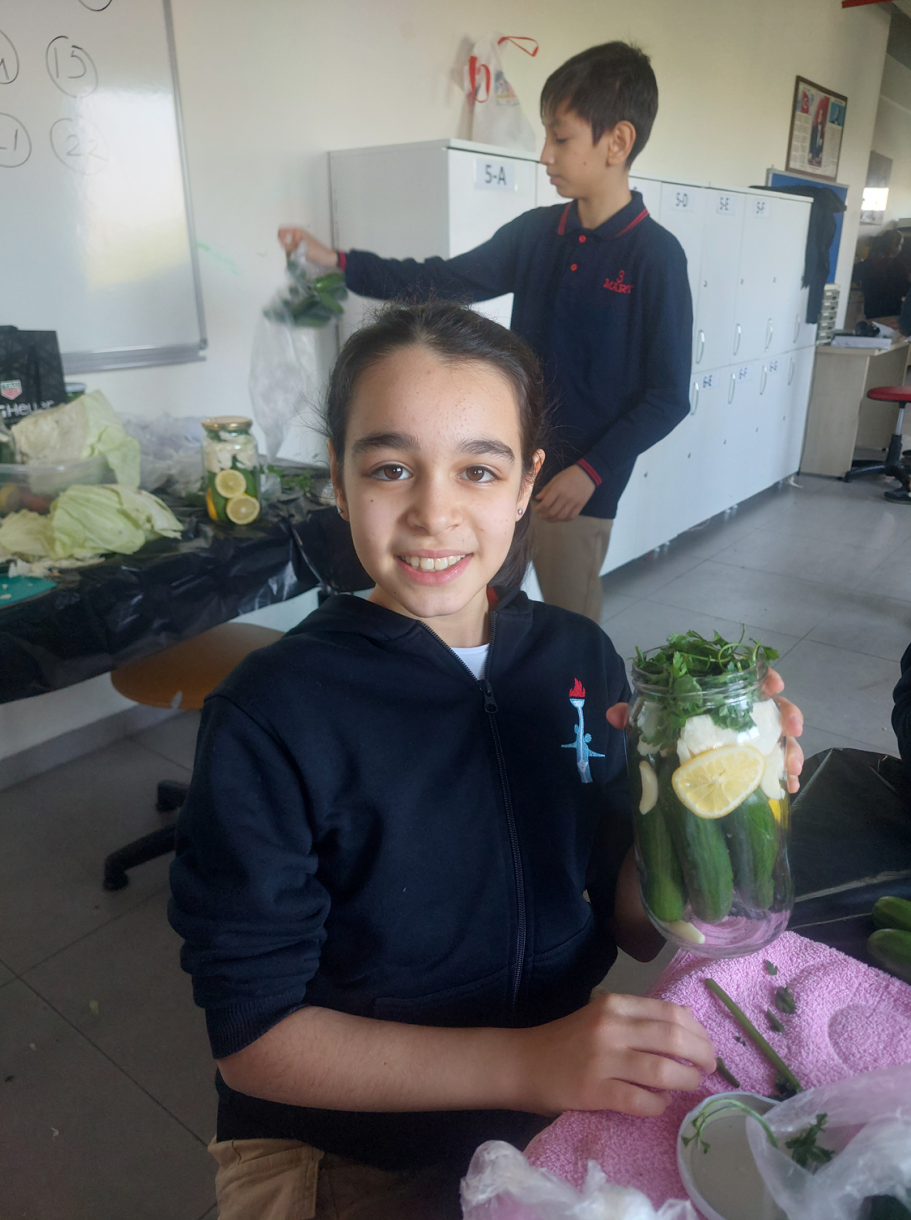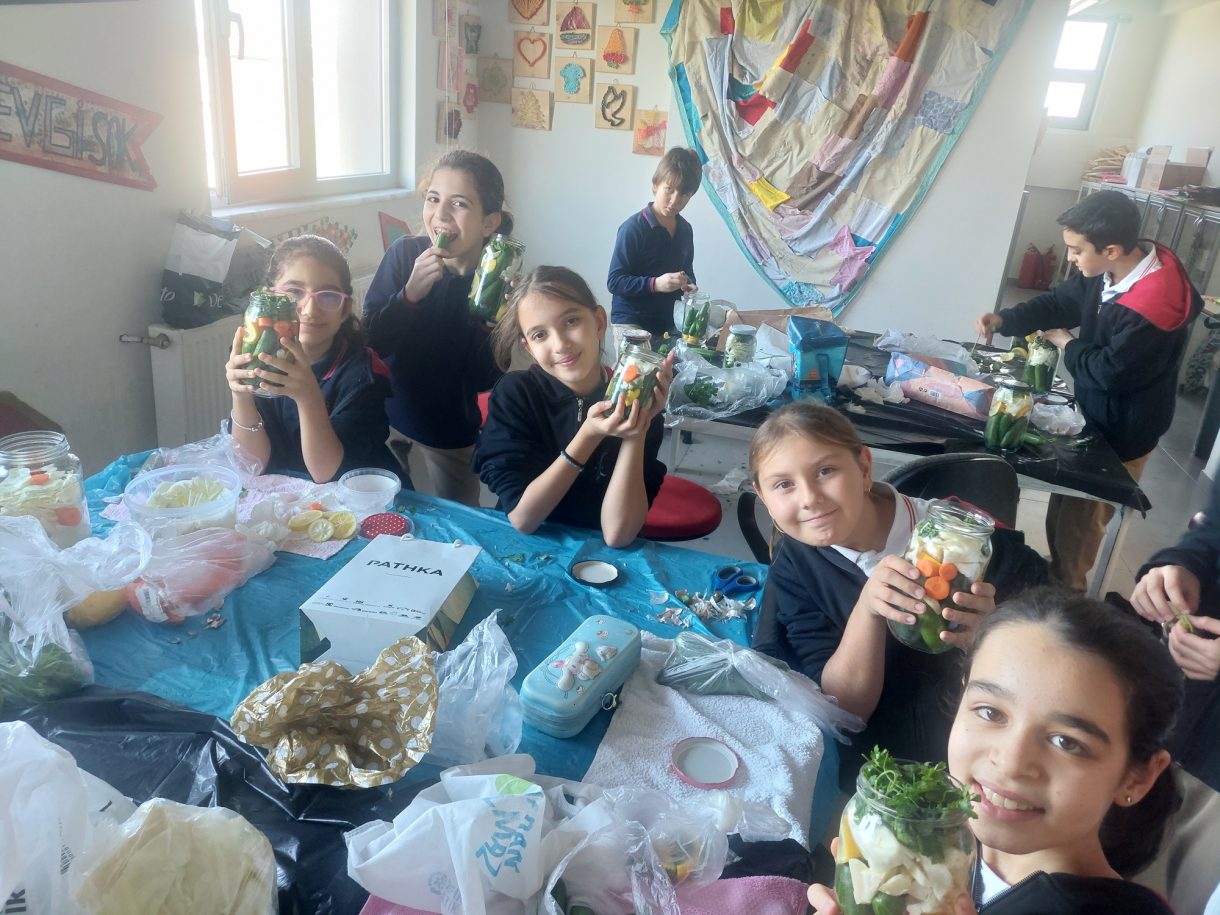 Hazır gıda tüketimini azaltma bilinci oluşturmayı amaçlayan etkinlikte öğrenciler; sebzeleri hazırlayıp kavanozlara yerleştirerek turşu kurma sürecini baştan sona uygulamalı olarak öğrendi. Etkinlik, öğrenciler için hem eğitici hem de keyifli bir ortam oluşturdu.