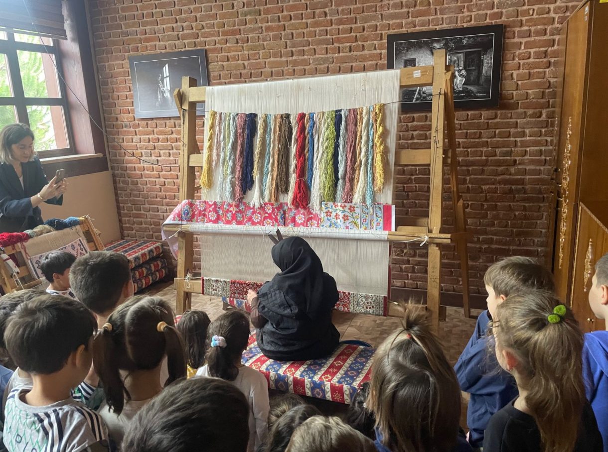 Kozaların sıcak suda bekletilerek ipek ipliğine dönüştürülmesi, bu iplerle geleneksel tezgâhlarda kumaş ve halı dokuma süreçleri ilgiyle izlendi. El yapımı şalların, kumaşların ve halıların sergilendiği alan da öğrenciler tarafından büyük bir merakla incelendi.