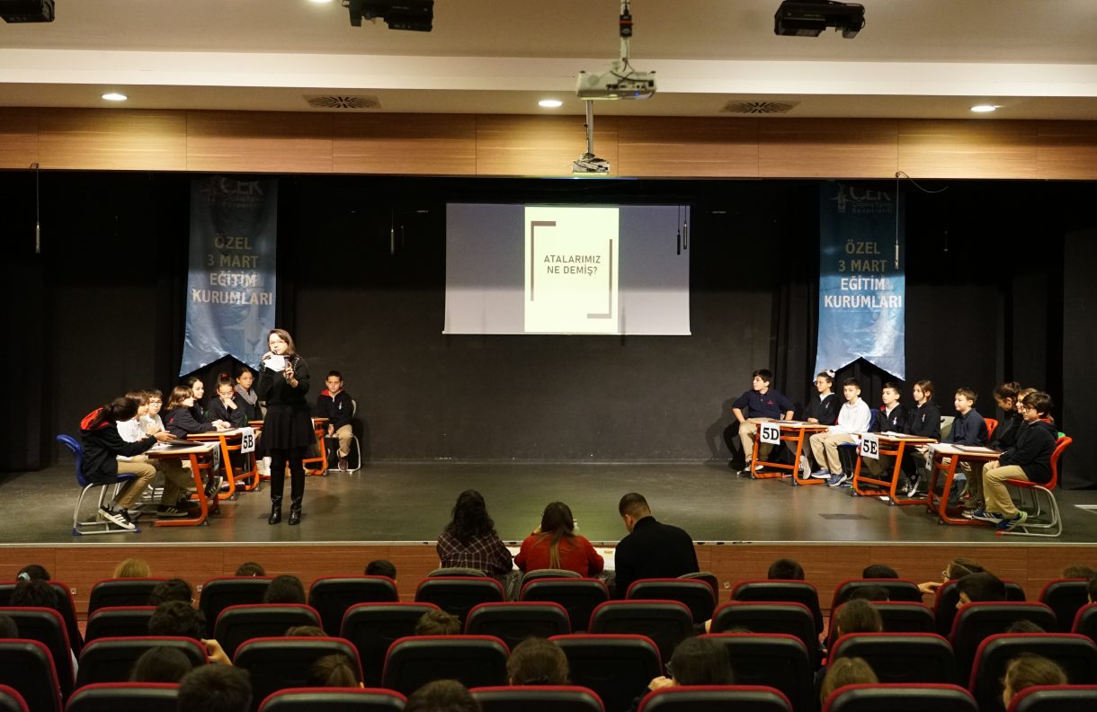 3 Mart Azizoğlu Ortaokulu Türkçe zümresinin her yıl düzenlediği geleneksel "Atalarımız Ne Demiş" yarışması, bu yıl da öğrencilerin yoğun ilgisi ve yüksek enerjisiyle gerçekleştirildi. 5. sınıflar arasında yapılan yarışmada öğrenciler, verilen görsellere uygun atasözleri ve deyimleri bulmak için kıyasıya mücadele etti. Hızlı ve doğru cevaplarıyla öne çıkan 5-D sınıfı, yarışmanın birincisi oldu. Birinci olan sınıfa madalyaları takdim edilirken, diğer tüm yarışmacılara da katılım belgeleri verildi.