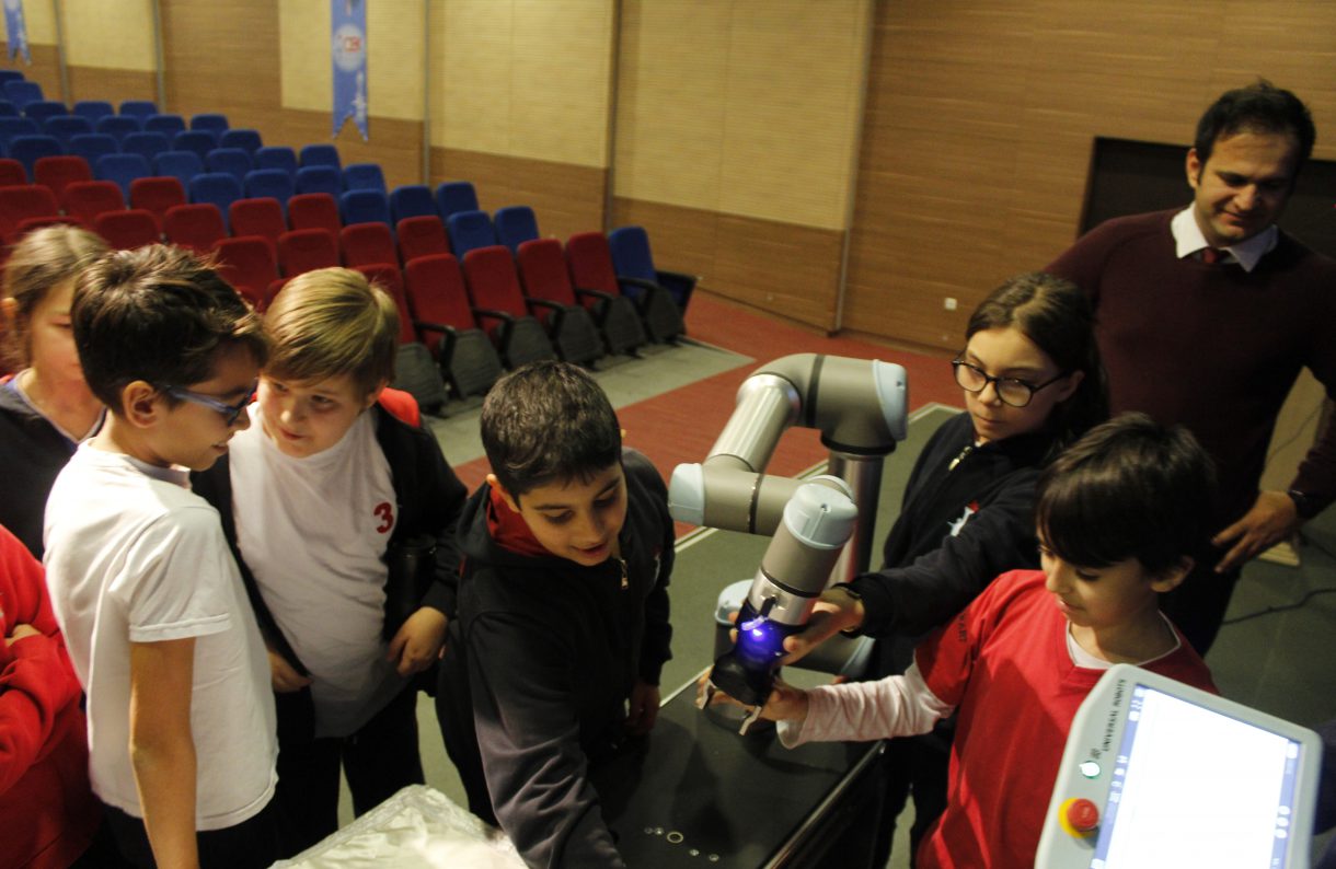 Öğrencilerimize bu gelişimi göstermek ve endüstri de kullanılan bu robotlar ile ilgili bilgilendirme konferansı düzenlendik. Universal Robots firmasından Kandan Özgür Gök ve Hakan Deniz Erden tarafından öğrencilerimize robotik araçların kullanım alanları ve amaçları hakkında sunum ve gösteri yapıldı. Öğrencilerimizin konu ile ilgili sorularını cevapladılar.
