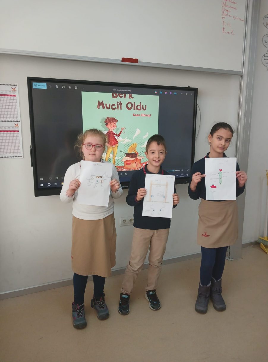 3 Mart Azizoğlu İlkokulu 3. sınıf öğrencileri, Berk Mucit Oldu kitabını okuyarak hayal güçlerini harekete geçirdi ve kendi icatlarını tasarladı.