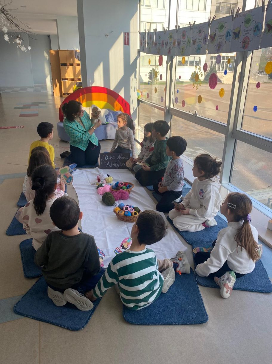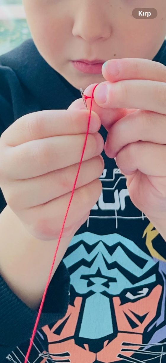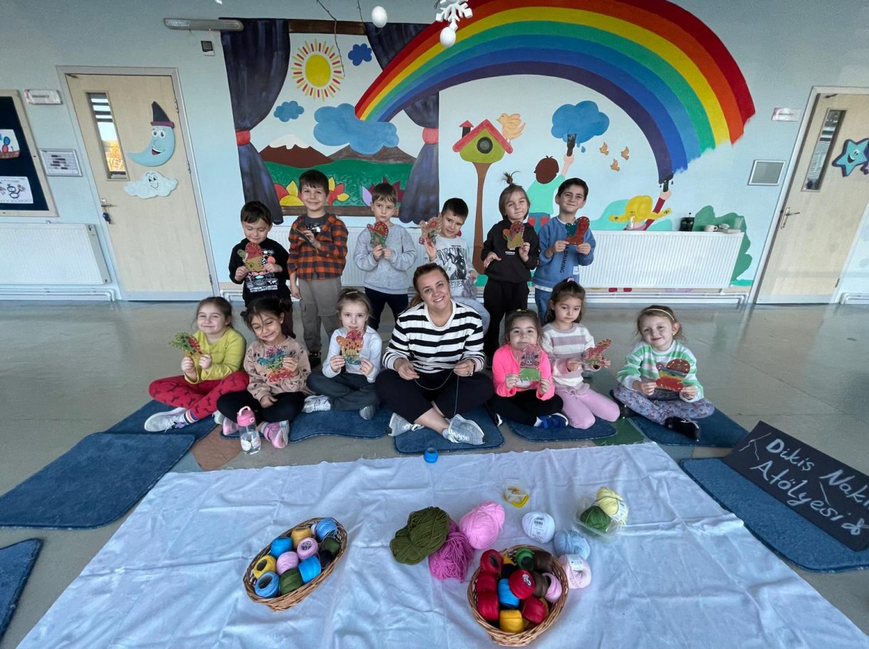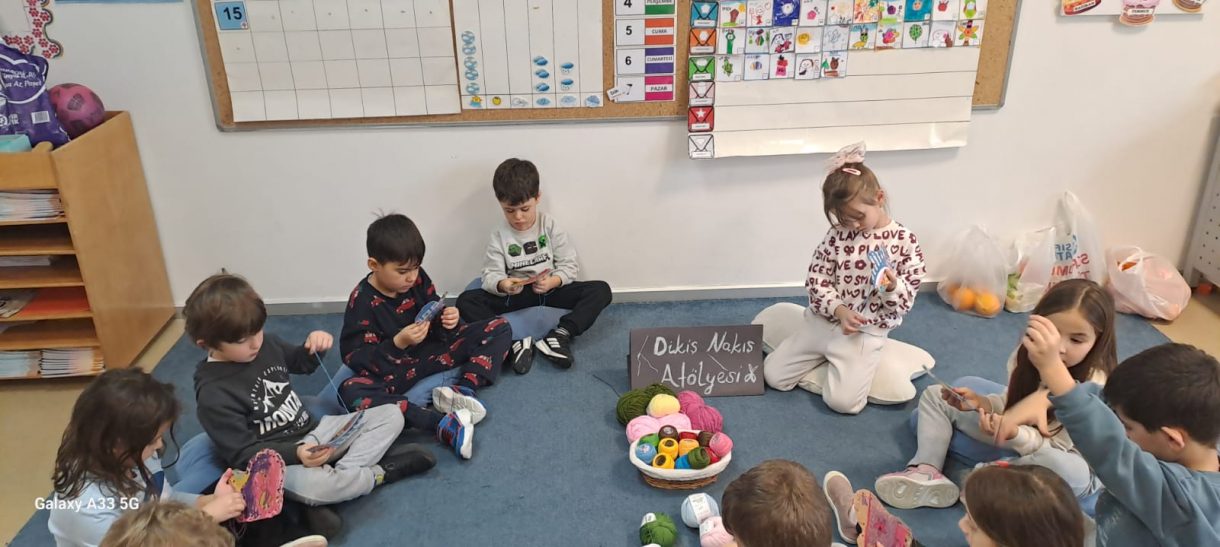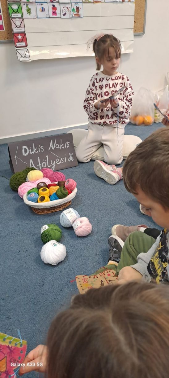 Etkinliğin devamında düzenlenen dikiş atölyesi ise miniklere el becerilerini deneyimleme fırsatı sundu. Renkli ipler ve iğnelerle kendi eldivenlerini tasarlayan öğrenciler, çapraz dikiş çalışmalarıyla hem ince motor becerilerini geliştirdi hem de yaratıcılıklarını ortaya koydu.