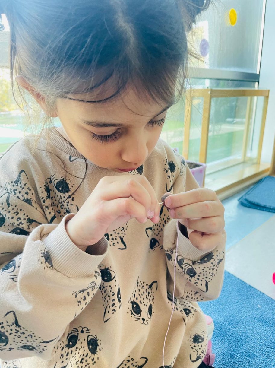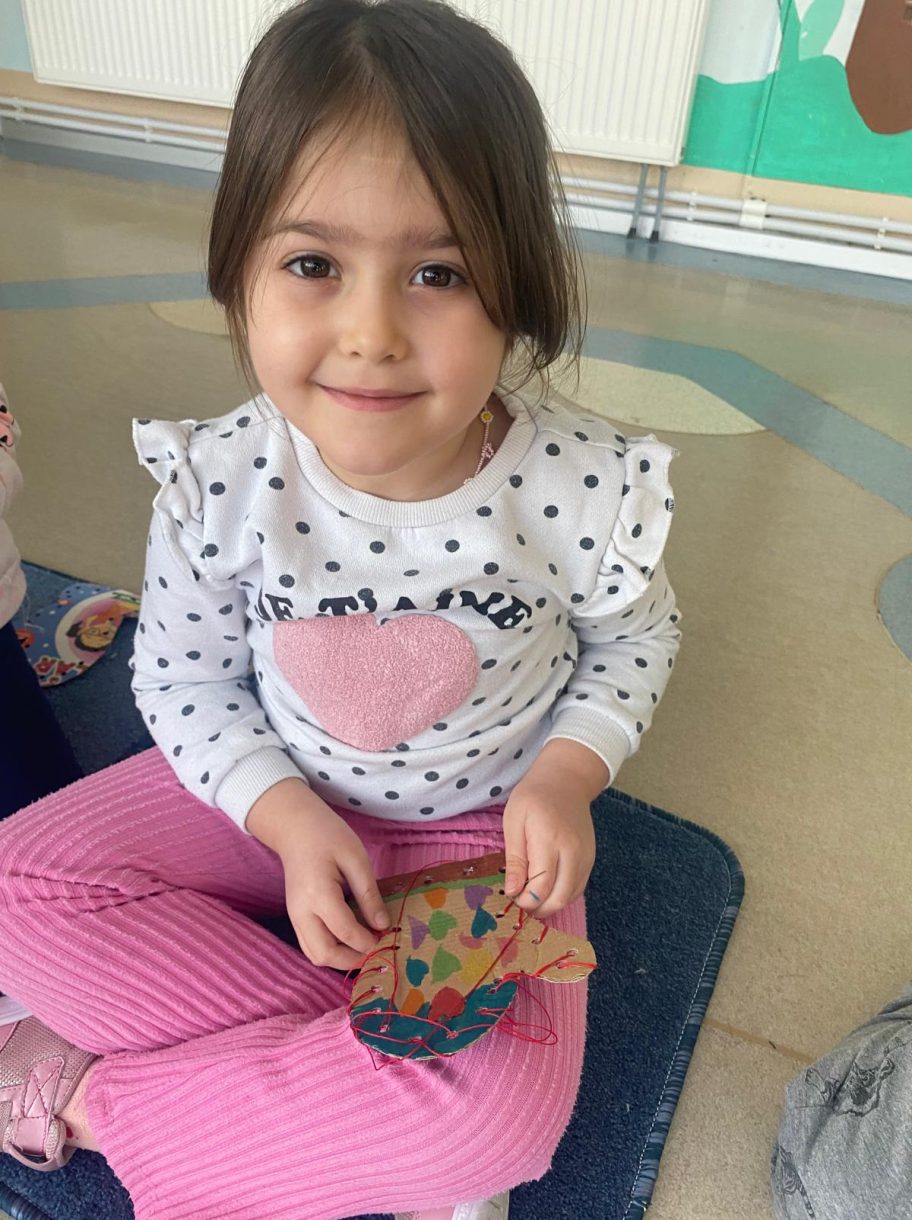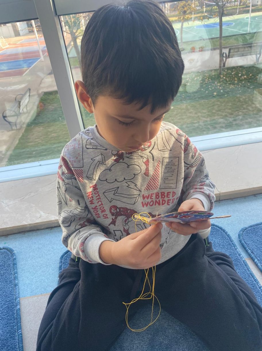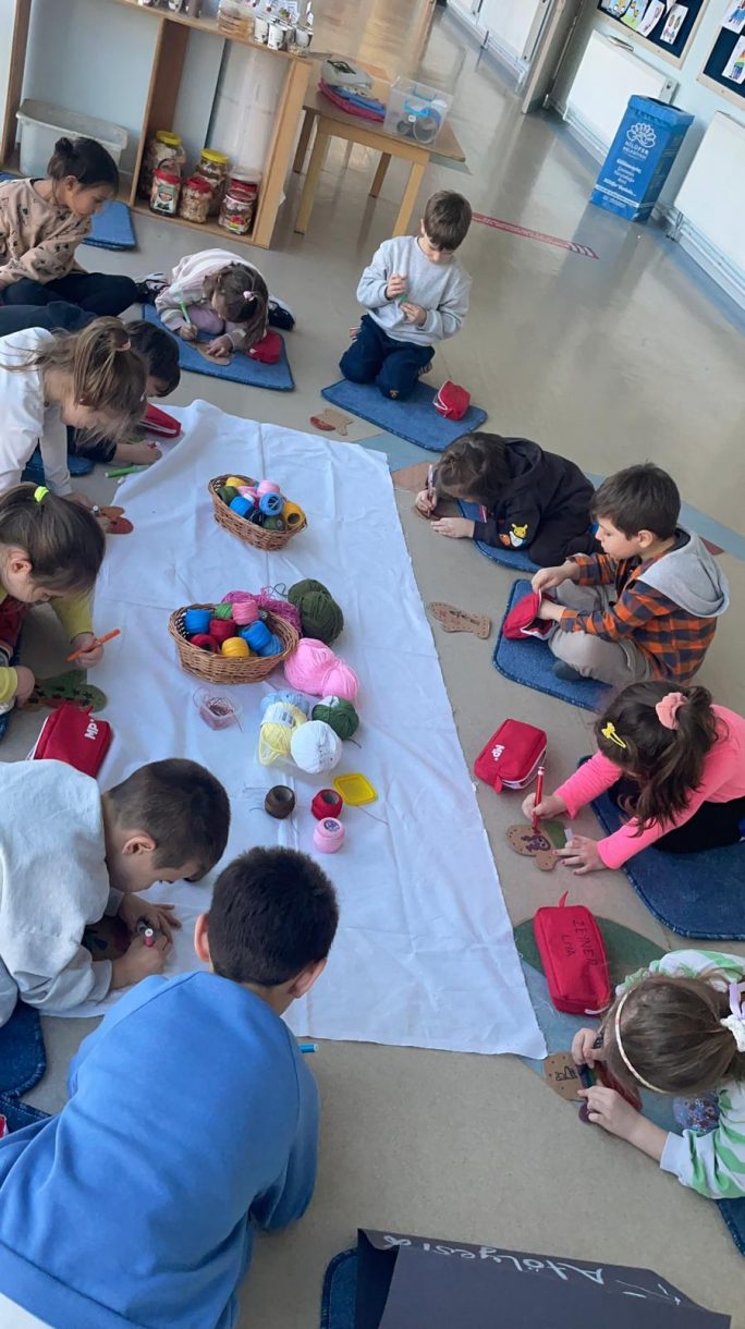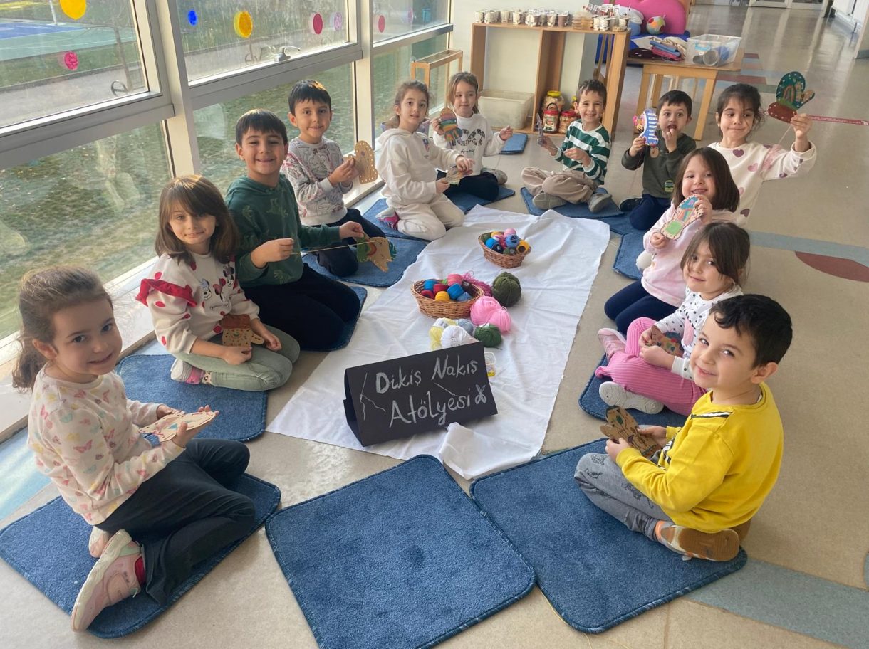 Etkinliğin devamında düzenlenen dikiş atölyesi ise miniklere el becerilerini deneyimleme fırsatı sundu. Renkli ipler ve iğnelerle kendi eldivenlerini tasarlayan öğrenciler, çapraz dikiş çalışmalarıyla hem ince motor becerilerini geliştirdi hem de yaratıcılıklarını ortaya koydu.