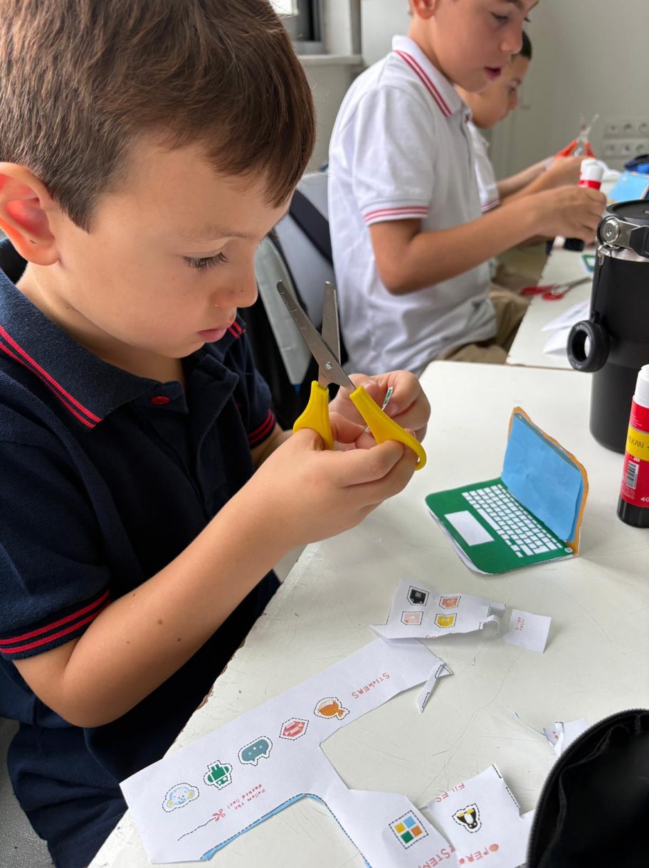 Etkinlikte öğrenciler, bilgisayar parçalarının yer aldığı çalışma kâğıtlarını tek tek kesip doğru yerlere yapıştırdı. Ardından bilgisayarın hangi parçalardan oluştuğunu ve bu parçaların ne işe yaradığını keşfettiler.