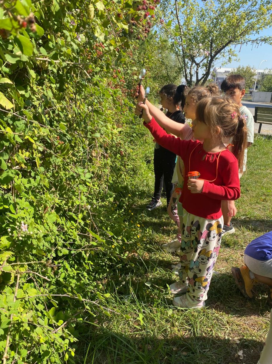 Büyüteçli gözlem kutularıyla bahçeye çıkan minikler, çiçekler, salyangozlar, böğürtlenler, taşlar ve dal parçaları gibi birbirinden ilginç doğa hazinelerini yakından inceledi. Topladıkları keşifleri heyecanla arkadaşlarıyla paylaşan öğrenciler hem öğrendi hem de eğlenceli anlar yaşadı.