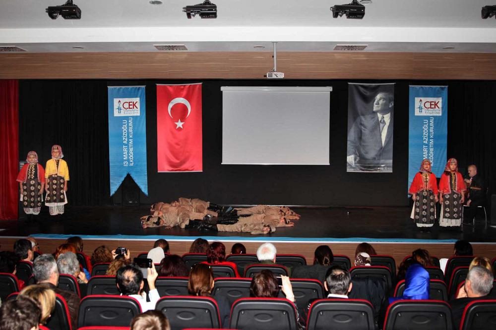 Çanakkale savaşlarının ve zaferinin, Türk Ulusu’nun önderi Mustafa Kemal Atatürk’ün unutulmayacağı, unutturulmayacağı temasının işlendiği ve Okulumuz Drama öğretmeni İ. Zeki KARABULUT’un sahnelediği oratorya, izleyenlere duygulu anlar yaşattı.Okul çağındaki çocukların askere gidişleri, savaş sırasında yaşananlar, Anadolu insanının hiçbir ayrım gözetmeksizin savaşa katılması dramatize edildi. Oyun Müzik öğretmenimiz Aslı TAPAN’ın Keman Bahadır SEVİK’ün ud eşliğinde seslendirdiği buram buram Anadolu kokan Halk türküleri ile desteklendi.