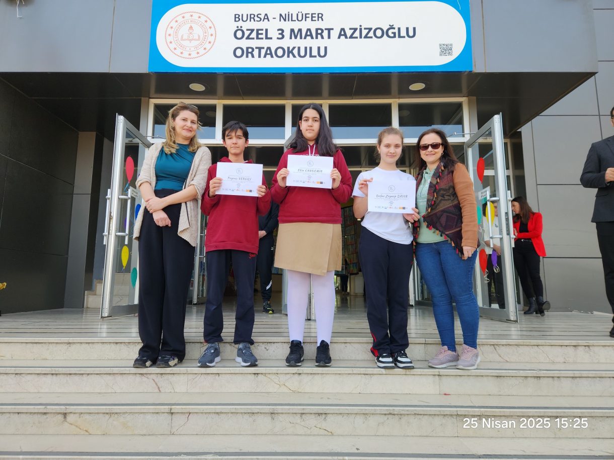 3 Mart Azizoğlu Ortaokulu 8. sınıf öğrencileri, İzmir Fransızca Öğretmenleri Derneği tarafından düzenlenen "GRAND QUIZ - Regards sur l'Environnement: les mers et les océans" (Çevreye Bakış: Denizler ve Okyanuslar) adlı bilgi yarışmasına katıldı.
