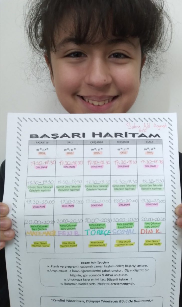 Rehber Öğretmenlerimizden İmran Gündoğan tarafından 6. ve 7. sınıf öğrencilerimize yönelik "Hayatımızdaki okul, aile, sosyal yaşam, arkadaşlık ilişkileri, ev çalışmaları, ödevler, dinlenme ve uyku gibi alanlar arasında nasıl denge kurabiliriz?" "Zamanımızı doğru yönetmeyi nasıl başarabiliriz?" Konularına yönelik farkındalık kazandırmak amacı ile sınıf içi etkinlik uygulamaları ve motivasyon konuşmaları gerçekleştirilmiştir.